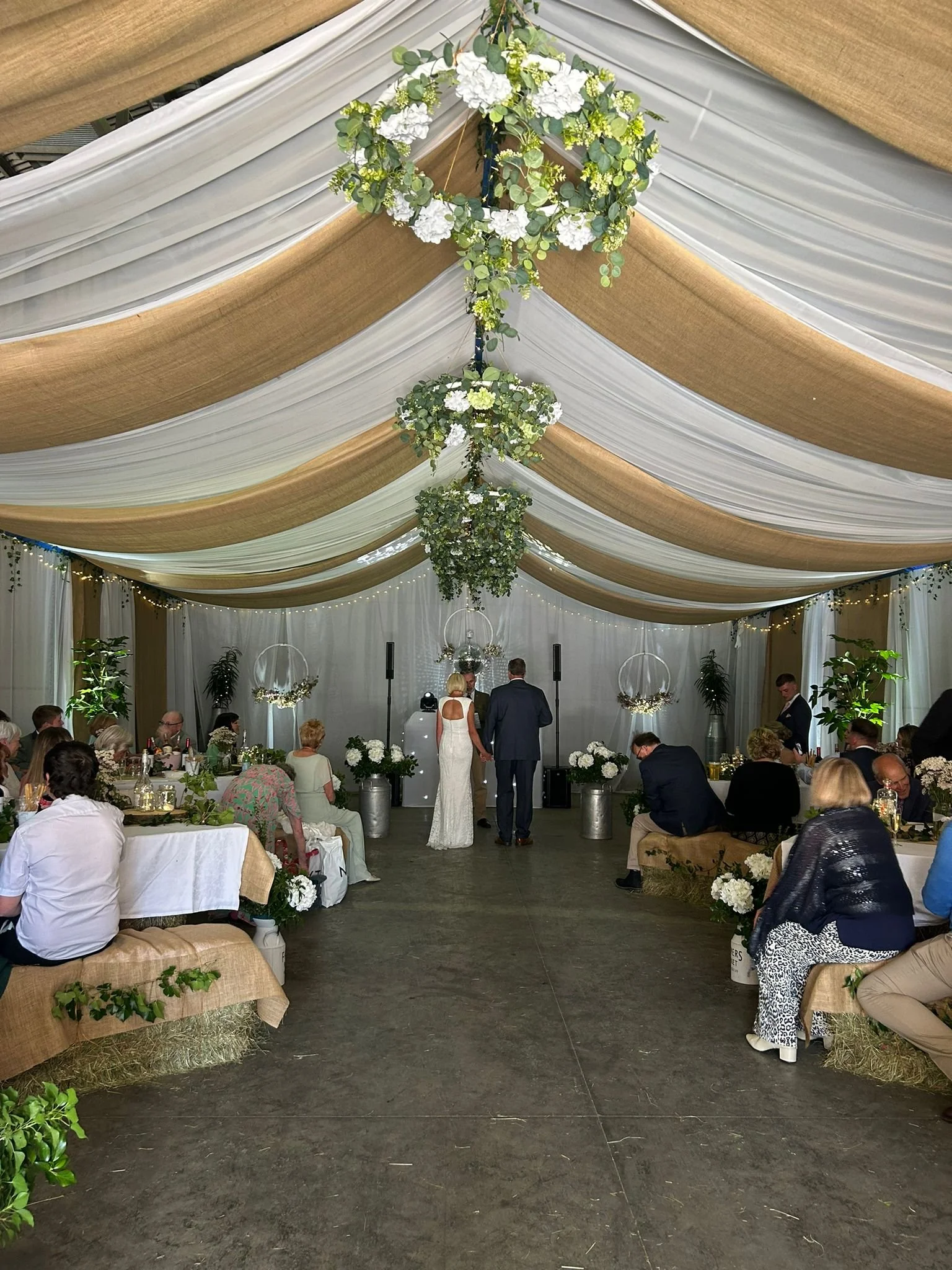 Would include fully decorated Hessian and white Voile drapes, hanging flowered hoops, fairy lights with hanging Ivy.